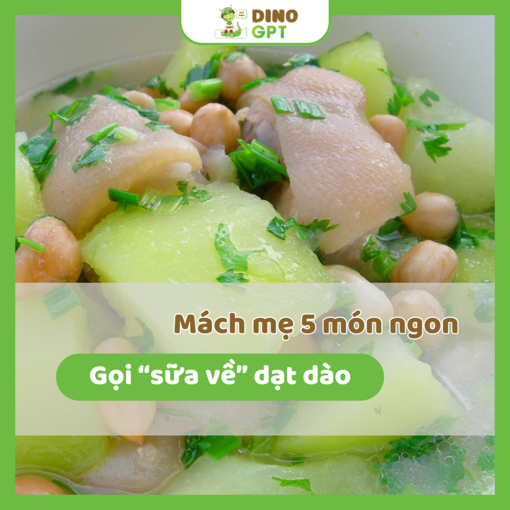 Để sữa về nhiều và chất lượng, mẹ cần có một chế độ ăn uống hợp lý, hạn chế đồ chiên xào nhiều dầu mỡ và thức ăn nhanh. Mẹ bổ sung ngay vào thực đơn những món ăn ngon, bổ dưỡng dưới đây để sữa lúc nào cũng tràn trề, thơm đặc. Cùng tham khảo những món ngon gọi sữa về với DinoGPT nhé!