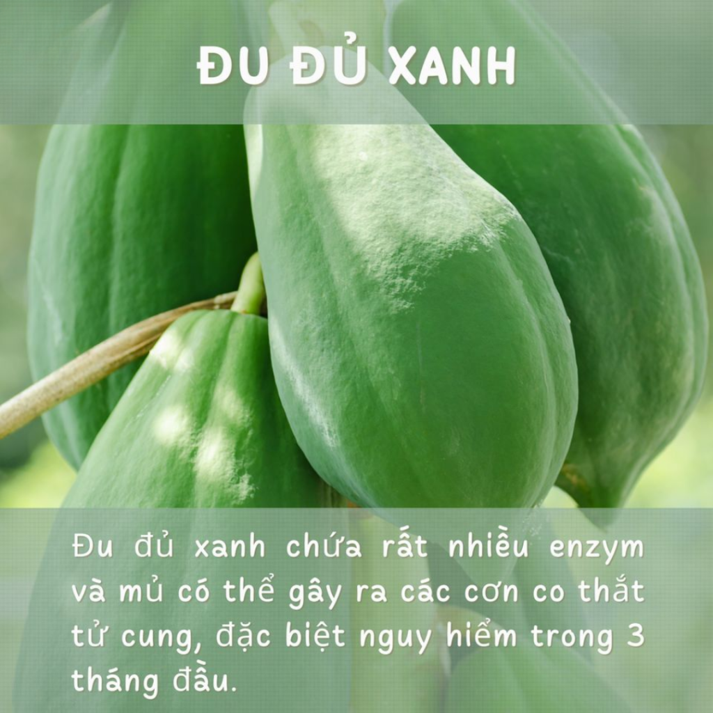 Trong đu đủ xanh và đu đủ chưa chín hẳn, có chứa rất nhiều enzym và mủ có thể gây ra các cơn co thắt tử cung, dẫn đến sẩy thai đặc biệt là trong 3 tháng đầu tiên của thai kỳ.